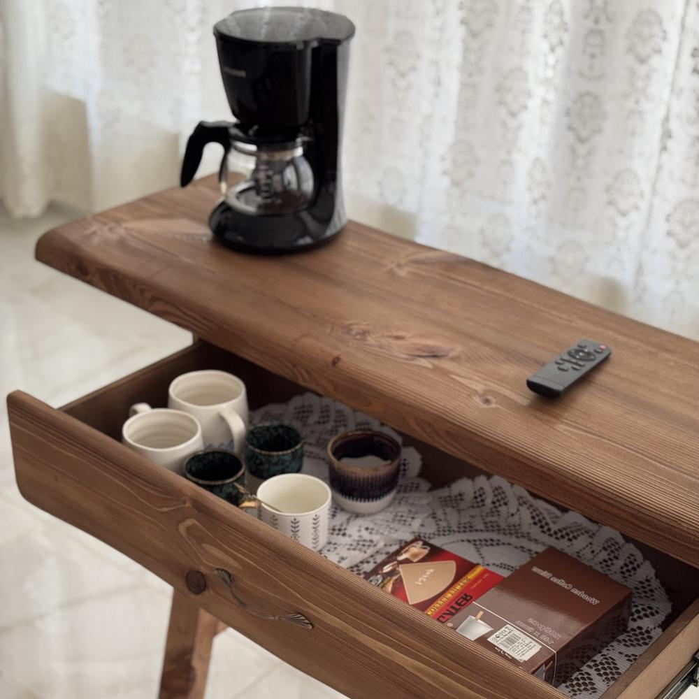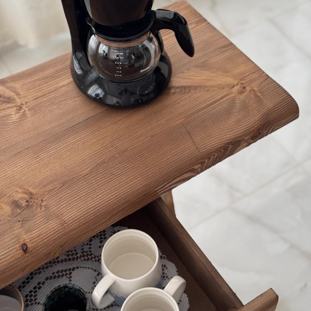 مضاف اليها درج (كبــير) لتخزين أكواب القهوه والمحصول من الخشب نفسه ليضيف شكل جميل على الطاولة